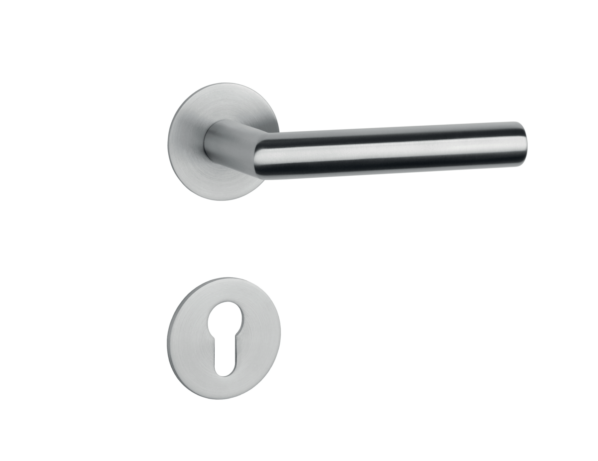 Rozetová klika na interiérové dveře s kulatou rozetou je vyrobena z odolné nerezavějící oceli s precizní povrchovou úpravou, která zabezpečuje dlouhou životnost a jednoduchou údržbu. Klika je vybavena dvojitými, samonivelačními kovovými pružinami a kliky dveří jsou trvale spojeny s kovovými adaptéry, což zaručuje prakticky celoživotní používání v domácích podmínkách.