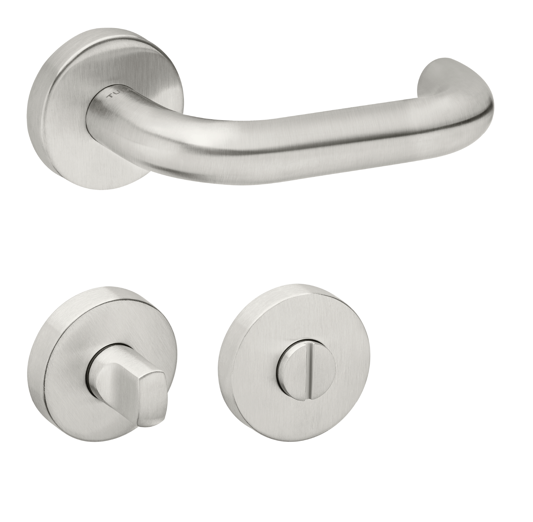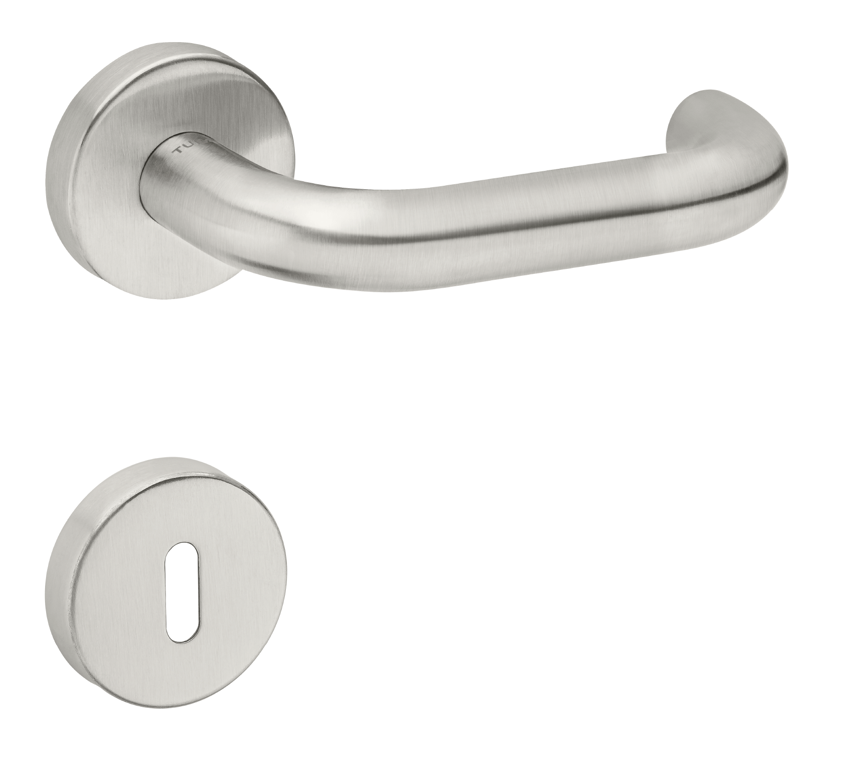 Rozetová klika na interiérové ​​dveře s kulatou rozetou je vyrobena z vysoce kvalitní nerezavějící oceli, známé jako nerez a je povrchově upravena. Rozeta má průměr 52 mm a standardní tloušťku 11 mm.