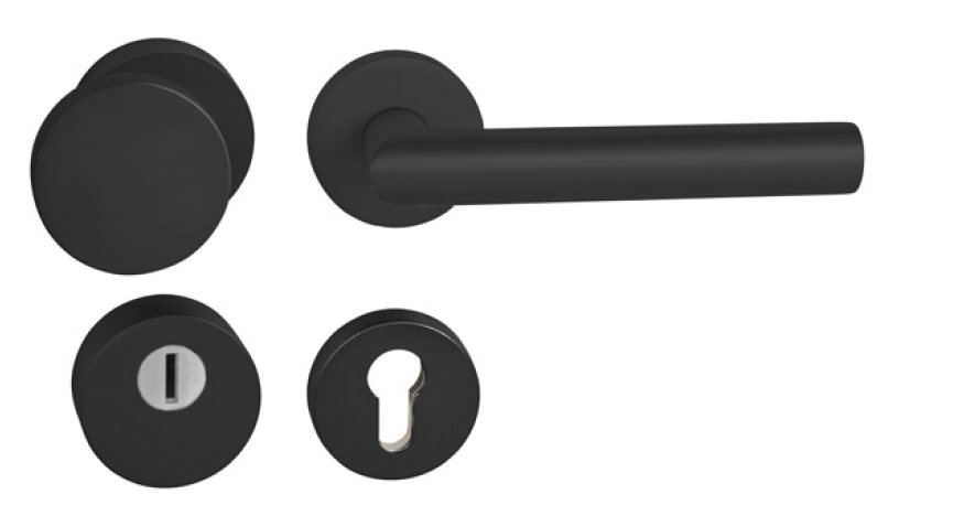 Bezpečnostní interiérová rozetová klika na vchodové a bezpečnostní dveře s kulatou rozetou s překrytím cylindrické vložky je vyrobená z materiálů vysoké kvality – zamak / ocel a je povrchově upravená. Kulatá rozeta má průměr 52 mm a tloušťku 17 mm.