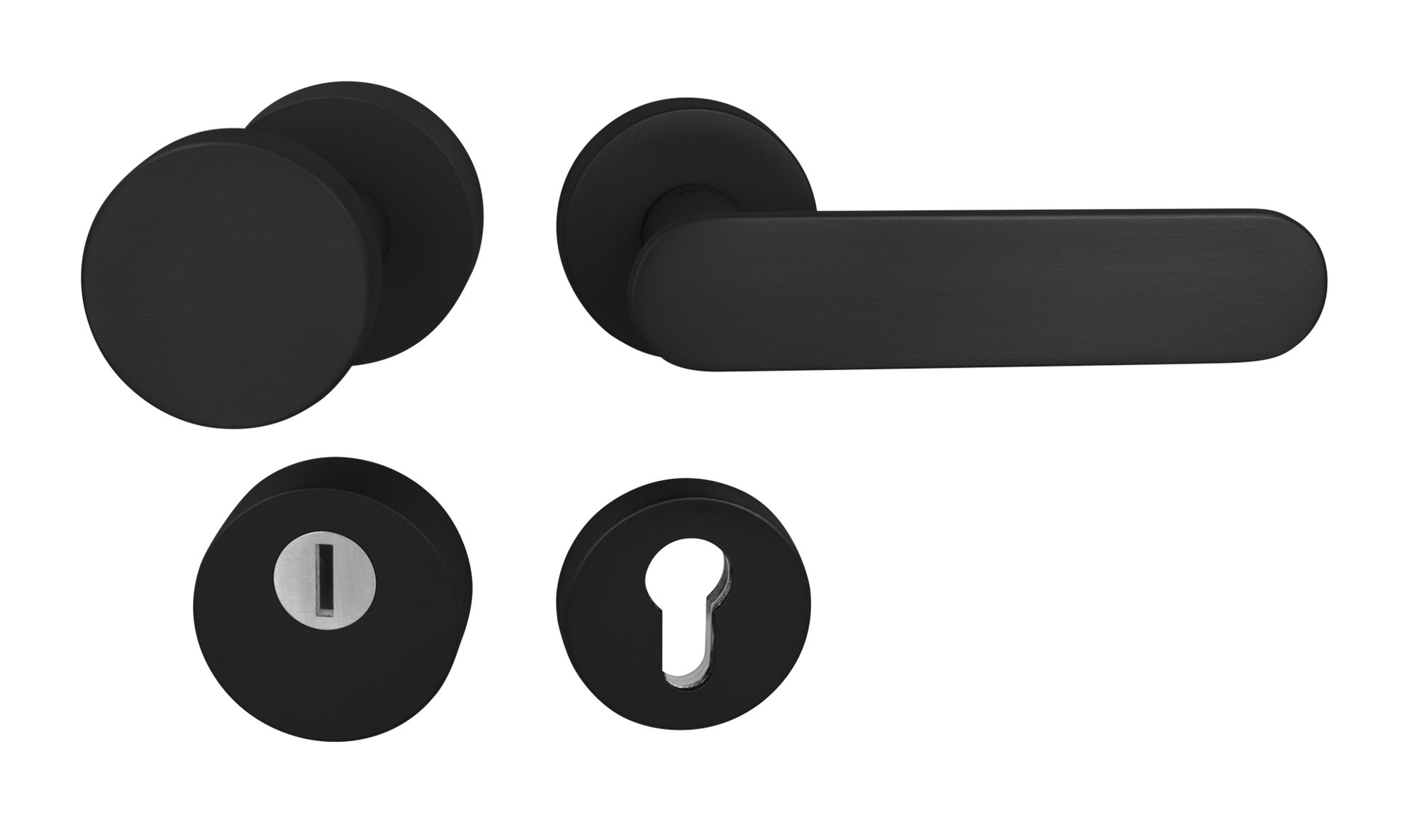 Bezpečnostní interiérová rozetová klika na vchodové a bezpečnostní dveře s kulatou rozetou s překrytím cylindrické vložky je vyrobená z materiálů vysoké kvality – zamak / ocel a je povrchově upravená. Kulatá rozeta má průměr 52 mm a tloušťku 17 mm.