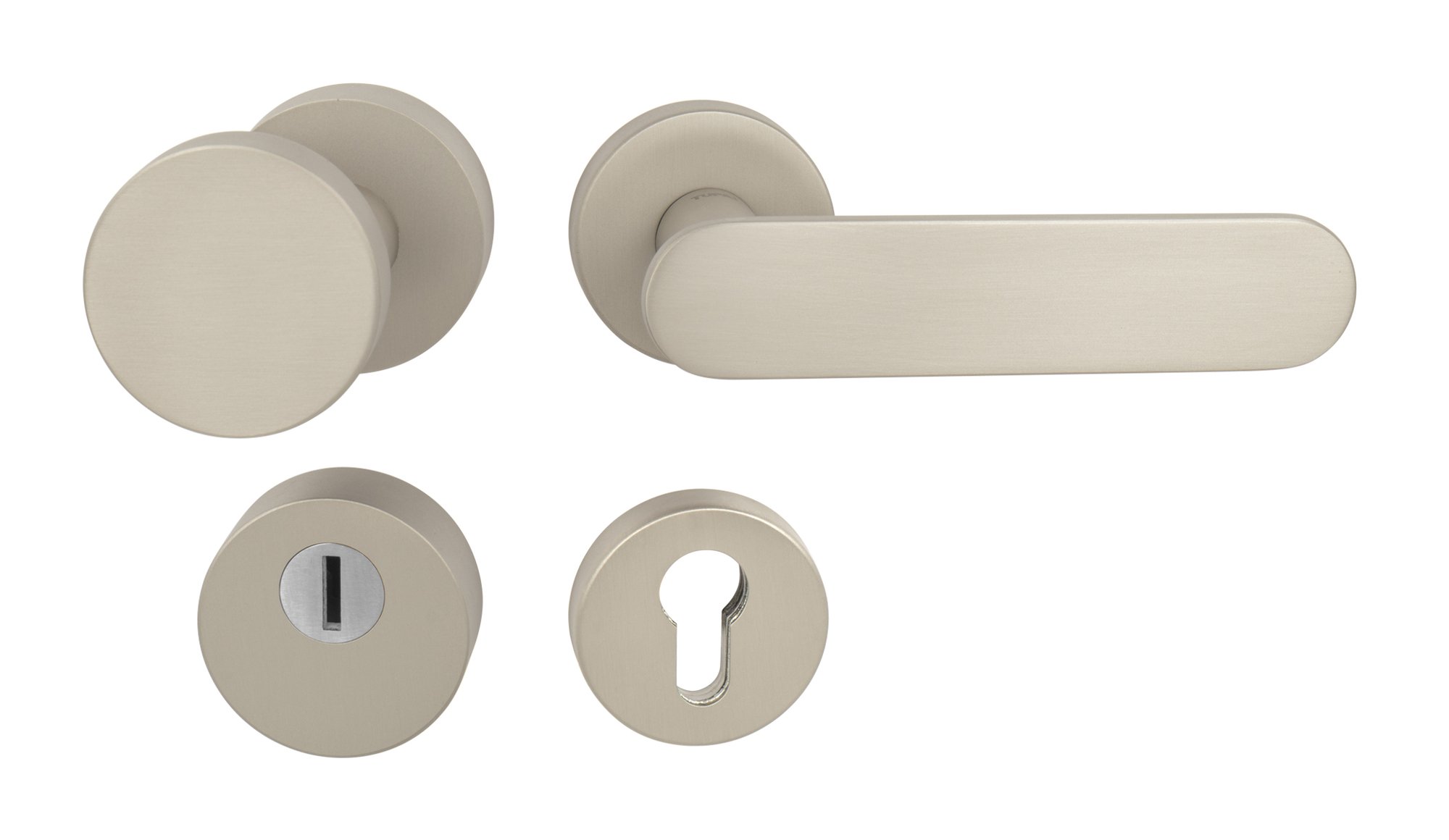Bezpečnostní interiérová rozetová klika na vchodové a bezpečnostní dveře s kulatou rozetou s překrytím cylindrické vložky je vyrobená z materiálů vysoké kvality – zamak / ocel a je povrchově upravená. Kulatá rozeta má průměr 52 mm a tloušťku 17 mm.