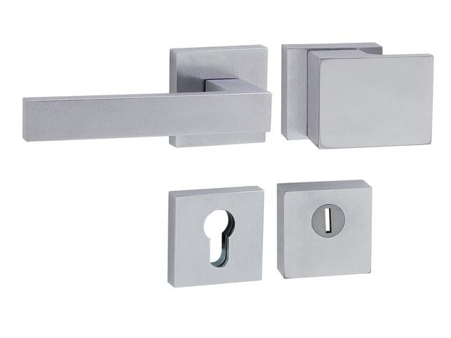 Rozetová klika na vchodové a bezpečnostní dveře s hranatou rozetou s překrytím cylindrické vložky je vyrobena z materiálů vysoké kvality - zamak / ocel a je povrchově upravena. Hranatá rozeta má rozměry 52 mm x 52 mm (resp. 55 mm x 52 mm) a tloušťku 17 mm.