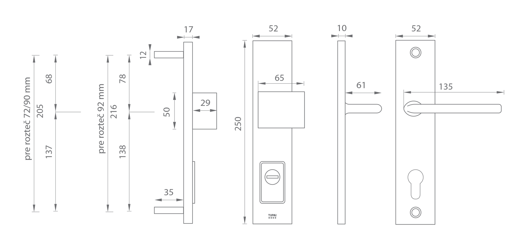 Jelikož jsme se přímo podíleli na vývoji TUPAI SAFETY LINE, můžeme zaručit kvalitu tohoto extrémně odolného kování. Madlo je kotvené na dvou pevnostních šroubech pro celoživotní fixaci bez možnosti samovolného uvolnění. Ocelová závitová pouzdra, která zajišťují prošroubování přes dveře, jsou chráněna ocelovou kuličkou a podložkou proti odvrtání. Ocelové překrytí je uchyceno z vnitřní strany na 4 pevnostní šrouby a výsuv překrytí vložky je nastavitelný do 3 mm. Mechanismus umožňuje uzamykání tahem kliky nahoru. Kování má vlastní vratný mechanismus - pružinu, která zabezpečí vodorovnou polohu kliky nezávisle na zámku.