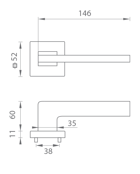 Rozetová klika na interiérové ​​dveře s hranatou rozetou je vyrobena z materiálů vysoké kvality - zamak a je povrchově upravena. Rozeta má rozměry 52 mm x 52 mm a standardní tloušťku 11 mm.