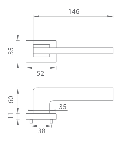 Rozetová klika na interiérové dveře s obdélníkovou rozetou je vyrobena z materiálů vysoké kvality - zamak a je povrchově upravena. Rozeta má rozměry 52 mm x 35 mm a standardní tloušťku 11 mm.