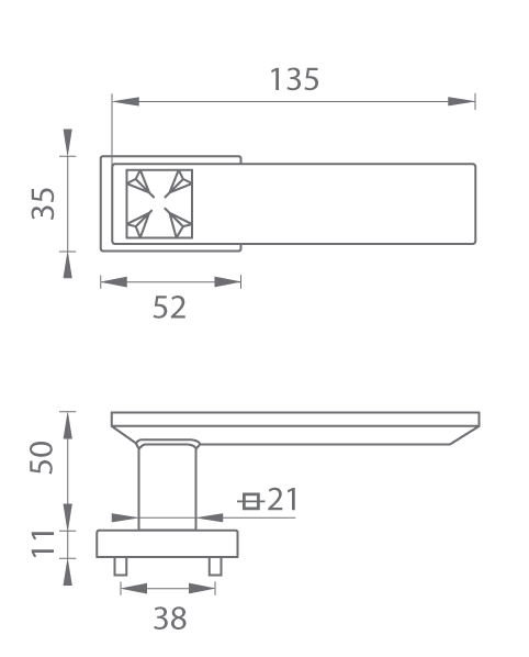 Rozetová klika na interiérové dveře s obdélníkovou rozetou je vyrobena z materiálů vysoké kvality - zamak a je povrchově upravena. Rozeta má rozměry 52 mm x 35 mm a standardní tloušťku 11 mm.