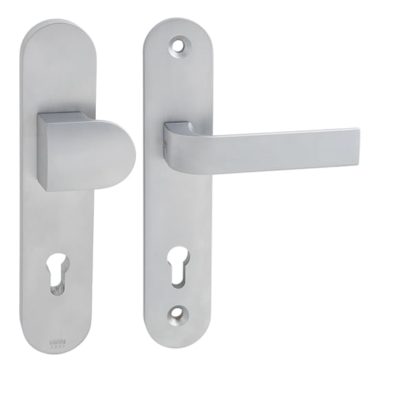 Štítová klika na vchodové a bezpečnostní dveře s bezpečnostním oválným štítem s překrytím cylindrické vložky je vyrobena z materiálů vysoké kvality - zamak a je povrchově upravena. Oválný štít má rozměry 52 mm x 250 mm a tloušťku 17 mm.