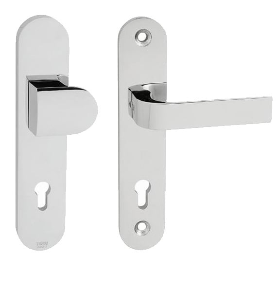 Štítová klika na vchodové a bezpečnostní dveře s bezpečnostním oválným štítem s překrytím cylindrické vložky je vyrobena z materiálů vysoké kvality - zamak a je povrchově upravena. Oválný štít má rozměry 52 mm x 250 mm a tloušťku 17 mm.