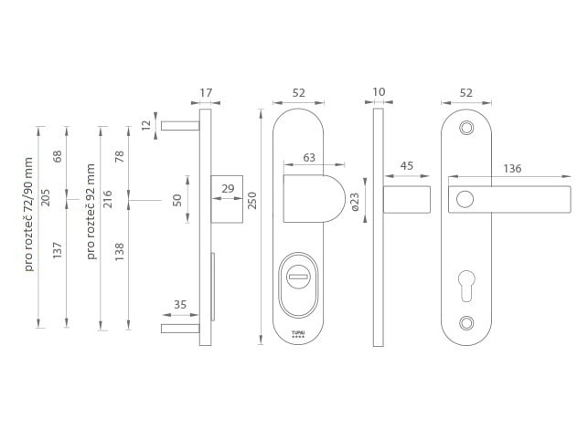 Štítová klika na vchodové a bezpečnostní dveře s bezpečnostním oválným štítem s překrytím cylindrické vložky je vyrobena z materiálů vysoké kvality - zamak a je povrchově upravena. Oválný štít má rozměry 52 mm x 250 mm a tloušťku 17 mm.