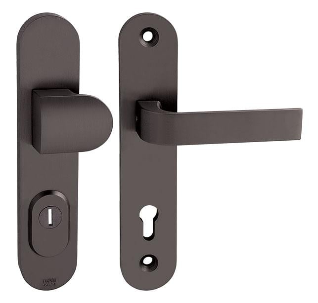 Štítová klika na vchodové a bezpečnostní dveře s bezpečnostním oválným štítem s překrytím cylindrické vložky je vyrobena z materiálů vysoké kvality - zamak a je povrchově upravena. Oválný štít má rozměry 52 mm x 250 mm a tloušťku 17 mm.