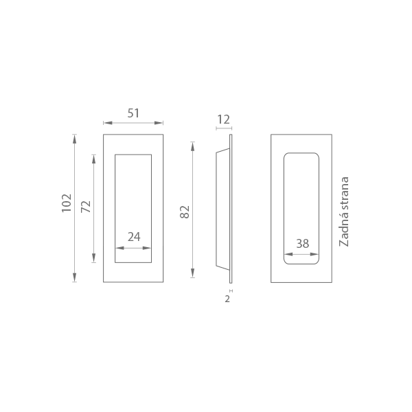 Hranatá mušle na posuvné dveře je vyrobena z vysoce kvalitní nerezavějící oceli (nerez) a je povrchově upravena stříkáním. Mušle má výšku 101 mm, šířku 51 mm, hloubku 10 mm a celkovou tloušťku 12 mm. Montáž mušle je lepením a upevněním dvěma šrouby.
