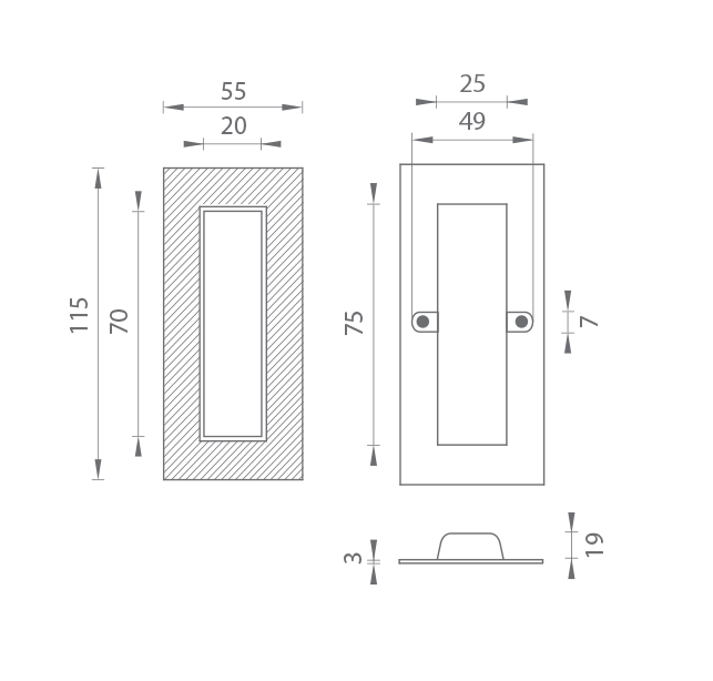 Hranatá mušle na posuvné dveře je vyrobena z materiálů vysoké kvality - zamak a je povrchově upravena. Mušle má výšku 115 mm, šířku 55 mm, zádlab 19 mm a celkovou tloušťku 23 mm. Upevnění samořezným šroubem - součástí balení jsou samořezné šrouby v příslušném počtu. Montáž krytky, mušle na magnet. Cena je uvedena za kus.