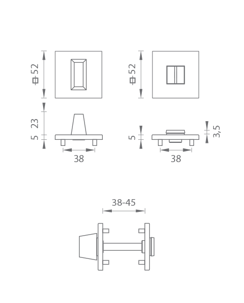 Hranatá rozeta je vyrobená z materiálů vysoké kvality - mosaz a je povrchově upravená. Rozeta má rozměry 52 mm x 52 mm, tloušťku jen 5 mm a hranatý otvor pro interiérový klíč (BBQ), otvor pro cylindrickou vložku (PZ) anebo WC set s vmontovaným klíčem.