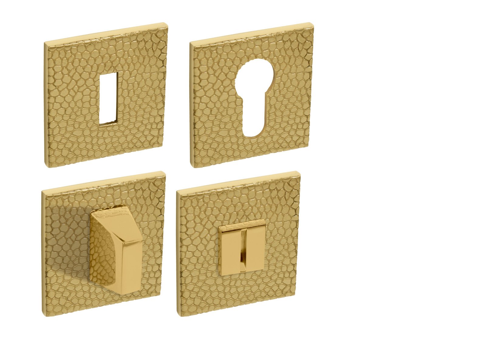 Hranatá rozeta je vyrobená z materiálů vysoké kvality - mosaz a je povrchově upravená. Rozeta má rozměry 52 mm x 52 mm, tloušťku jen 5 mm a hranatý otvor pro interiérový klíč (BBQ), otvor pro cylindrickou vložku (PZ) anebo WC set s vmontovaným klíčem.