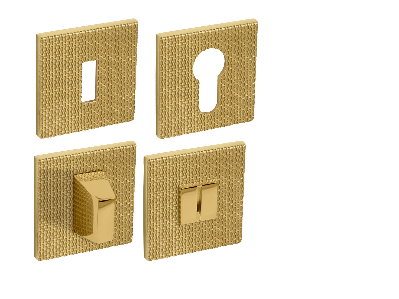 Hranatá rozeta je vyrobená z materiálů vysoké kvality - mosaz a je povrchově upravená. Rozeta má rozměry 52 mm x 52 mm, tloušťku jen 5 mm a hranatý otvor pro interiérový klíč (BBQ), otvor pro cylindrickou vložku (PZ) anebo WC set s vmontovaným klíčem.