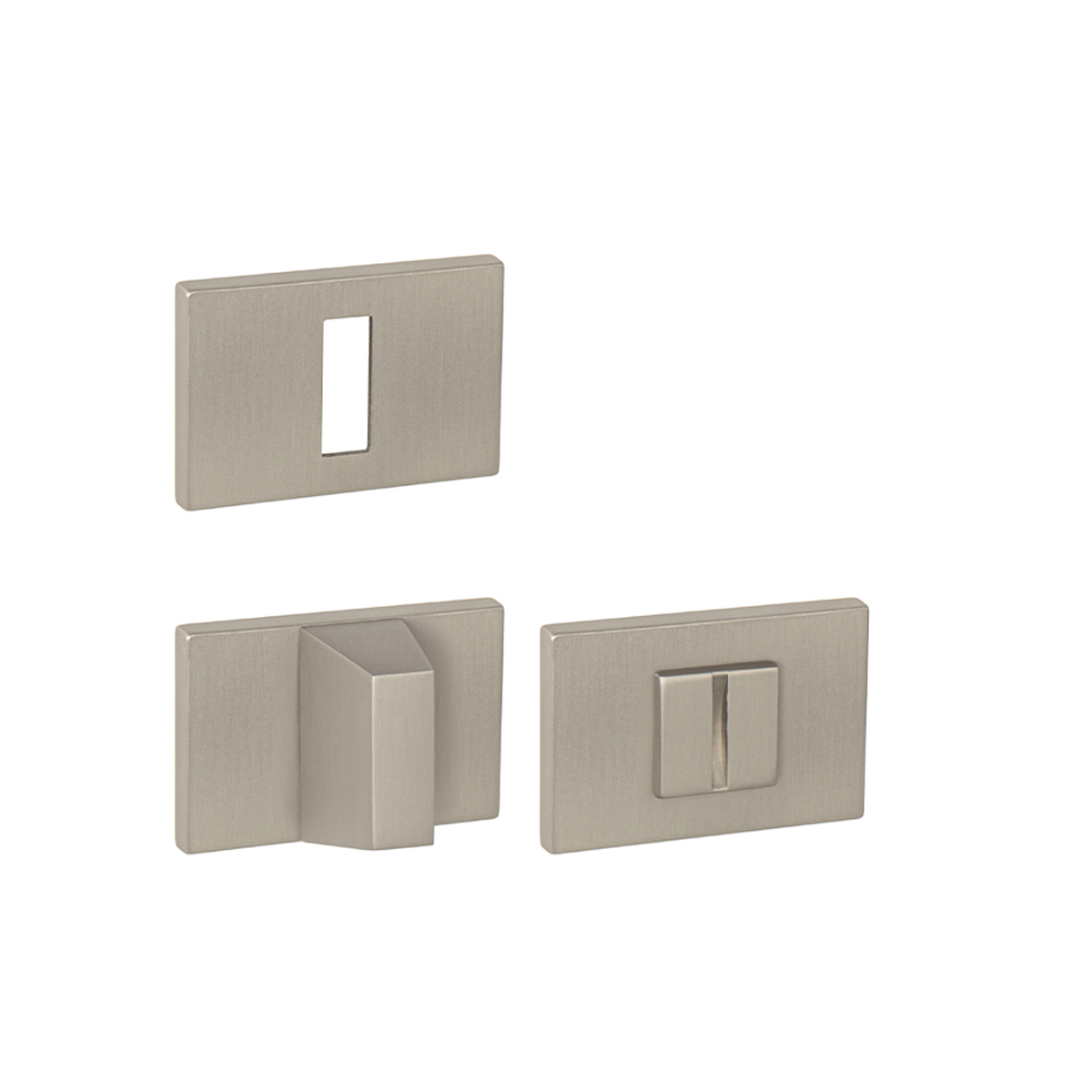 Rozeta má hranatý otvor pro interiérový klíč (BBQ) anebo WC set s vmontovaným klíčem. Balení obsahuje 2 kusy rozet (pár) a rozety WC jsou v balení jako set.