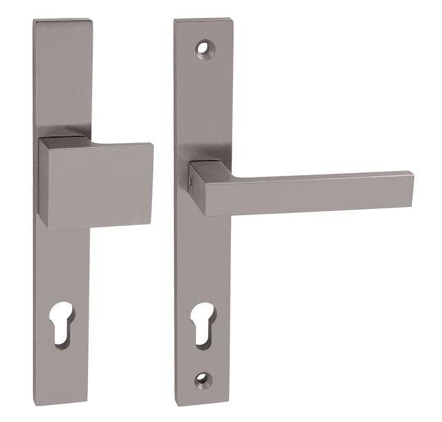 Zpevněné kování vyvinuté pro hliníkové, plastové nebo dřevěné dveře s úzkým profilem, kde se nevyžaduje bezpečnostní certifikát. Povrchová úprava chrom lesklý, chrom broušený, bílá, černá jsou vhodné i do exteriéru.