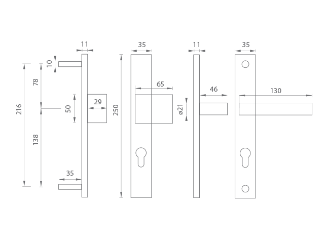 Štítová klika na vchodové a bezpečnostní dveře se zpevněným hranatým úzkým štítem bez překrytí cylindrické vložky je vyrobena z materiálů vysoké kvality - zamak a je povrchově upravena. Hranatý úzký štít má rozměry 35 mm x 250 mm a tloušťku 11 mm.