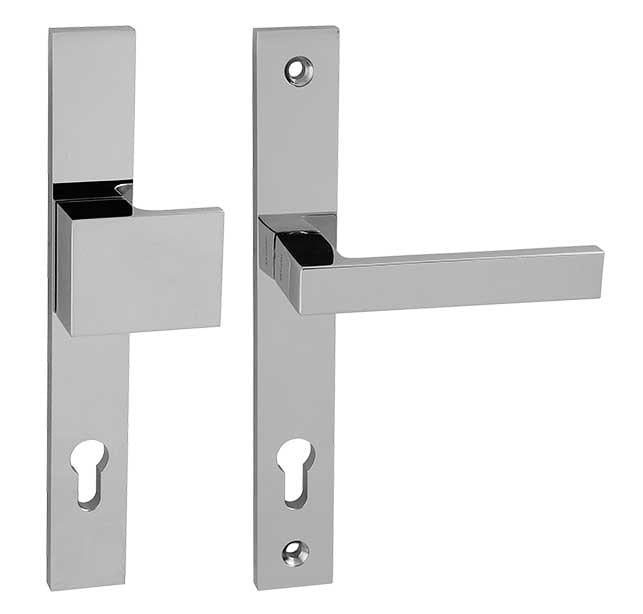 Zpevněné kování vyvinuté pro hliníkové, plastové nebo dřevěné dveře s úzkým profilem, kde se nevyžaduje bezpečnostní certifikát. Povrchová úprava chrom lesklý, chrom broušený, bílá, černá jsou vhodné i do exteriéru.