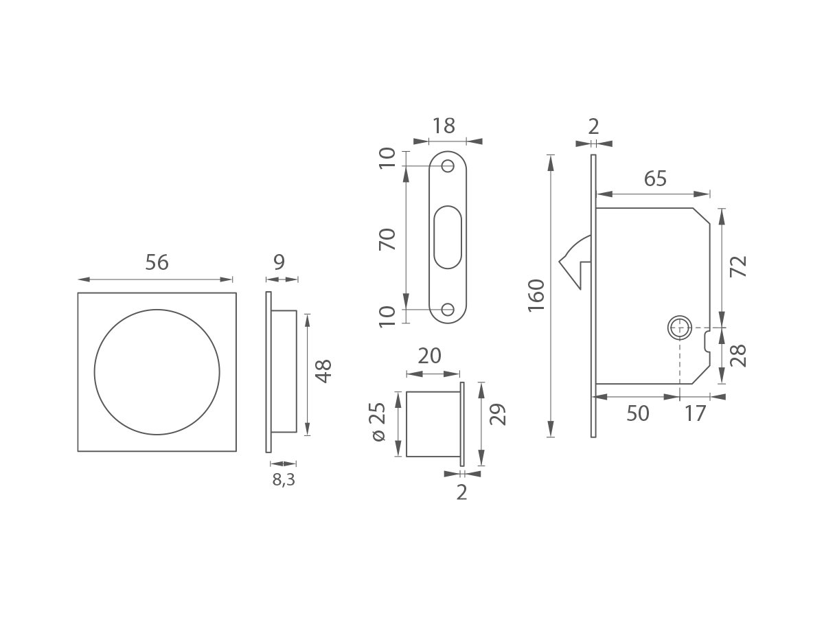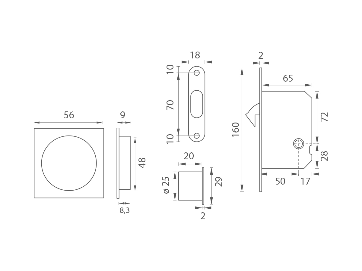 Hranatý set na posuvné dveře s WC klíčem s rozměry čela zámku v délce 160 mm, šířce 18 mm, tloušťce 2 mm.