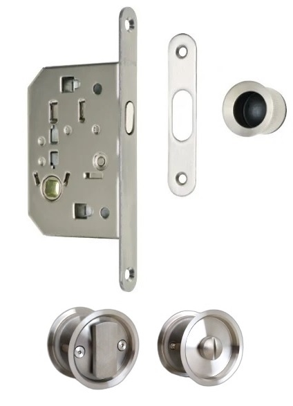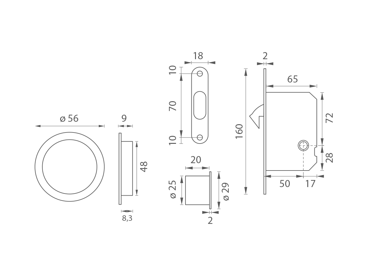 Kulatý set na posuvné dveře s WC klíčem s rozměry čela zámku v délce 160 mm, šířce 18 mm, tloušťce 2 mm.
