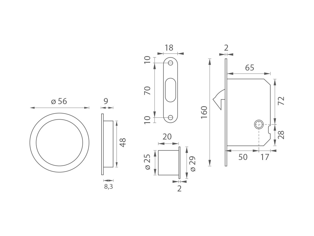 Kulatý set na posuvné dveře s WC klíčem s rozměry čela zámku v délce 160 mm, šířce 18 mm, tloušťce 2 mm.