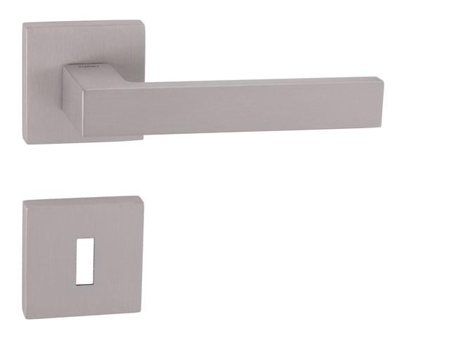 Rozetová klika na interiérové ​​dveře s hranatou rozetou je vyrobena z materiálů vysoké kvality - zamak a je povrchově upravena. Rozeta má rozměry 52 mm x 52 mm a standardní tloušťku 11 mm.