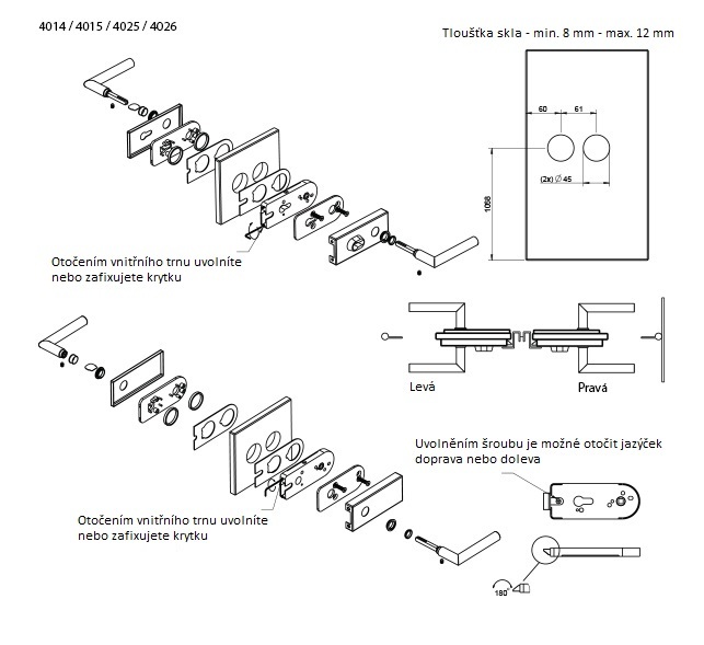 Pravo-levé kování na sklo. Levo a pravostrannost kování se jednoduše zvolí přesunutím zámku a otočením střelky na začátku montáže.