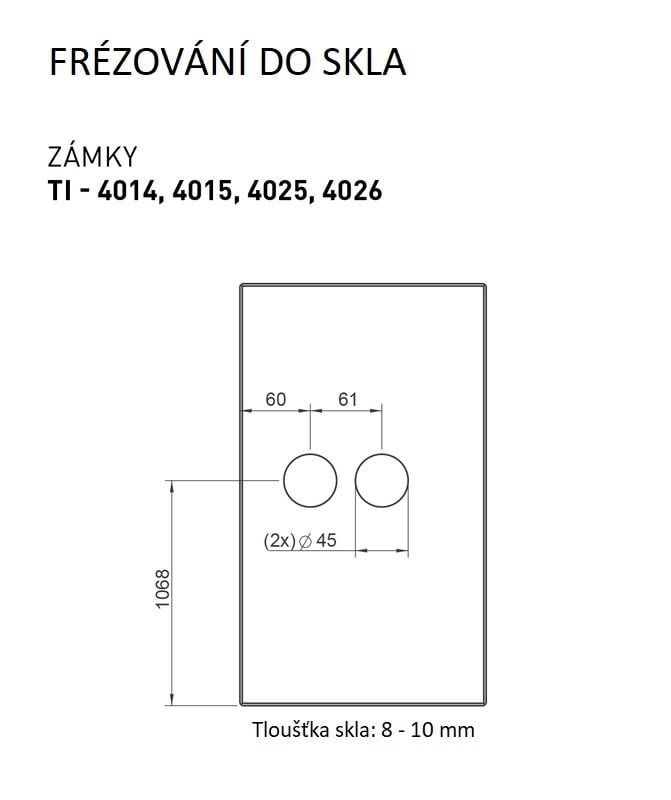 Zámek je vhodný pro skleněné dveře s tloušťkou 8 – 10 mm.  Otvor pro kliku obsahuje vymezovací mechanismus pro maximální eliminování vůle čtyřhranu. Mechanismus zámku umožňuje nastavení síly pružiny a napomáhá udržování kliky v horizontální poloze.