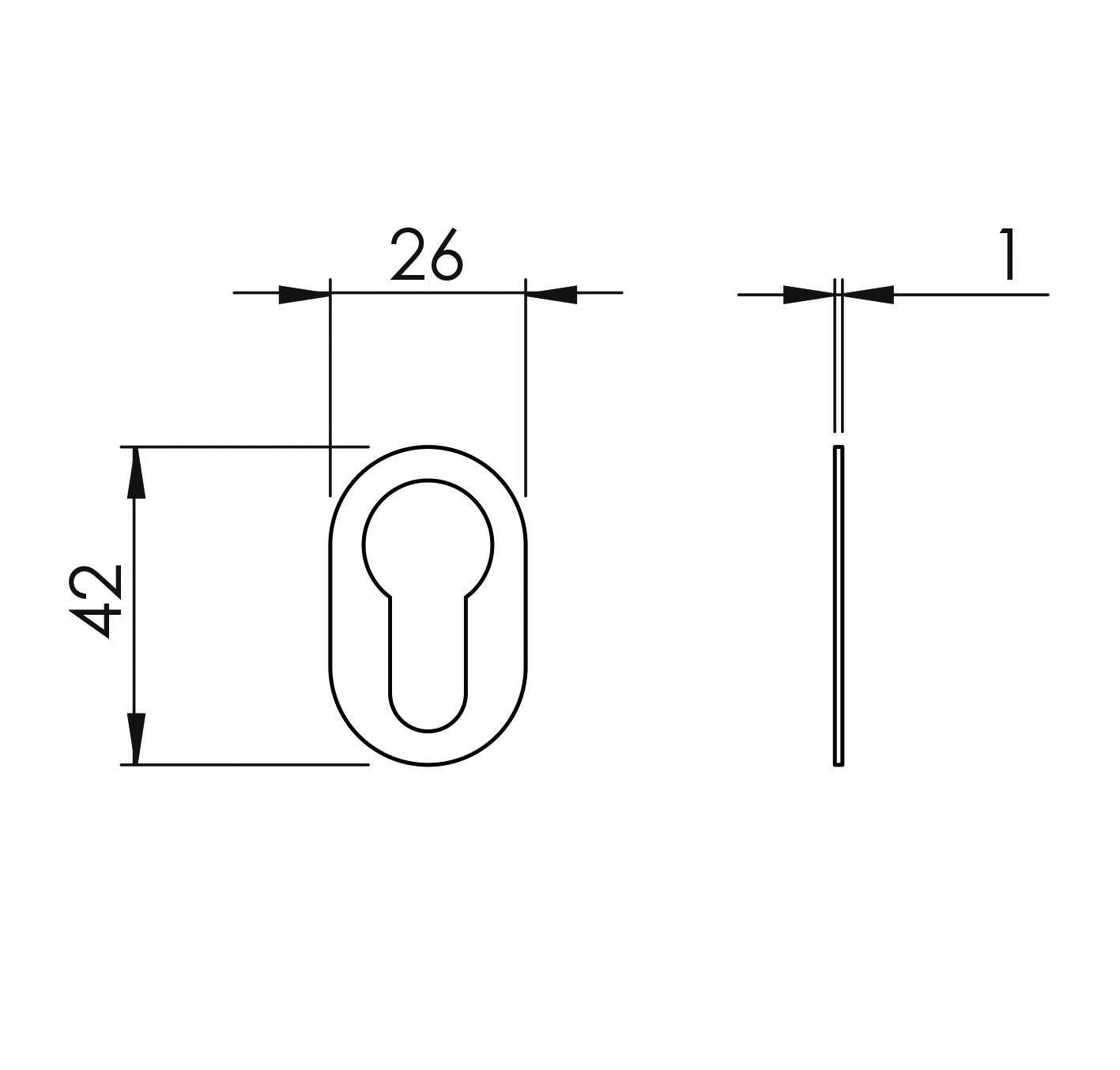 Úzká oválná rozeta je vyrobena z kvalitního materiálu zamak a je povrchově upravena. Rozeta má rozměr 26 x 42 mm a tloušťku 1 mm. Rozeta má oválný otvor pro interiérový klíč (BB) a otvor pro cylindrickou vložku (PZ). Balení obsahuje 2 kusy rozet (pár). Rozety je možné kombinovat s kteroukoliv klikou z kolekce NUDA.