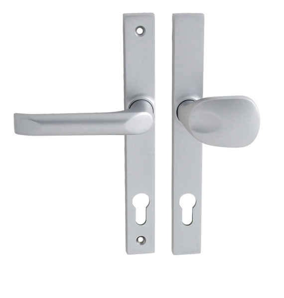 Štítová klika na vchodové a bezpečnostní dveře se zpevněným hranatým úzkým štítem bez překrytí cylindrické vložky je vyrobena z hliníku a je povrchově upravena. Hranatý úzký štít má rozměry 30 mm x 240 mm a tloušťku 10 mm.