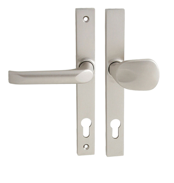 Štítová klika na vchodové a bezpečnostní dveře se zpevněným hranatým úzkým štítem bez překrytí cylindrické vložky je vyrobena z hliníku a je povrchově upravena. Hranatý úzký štít má rozměry 30 mm x 240 mm a tloušťku 10 mm.