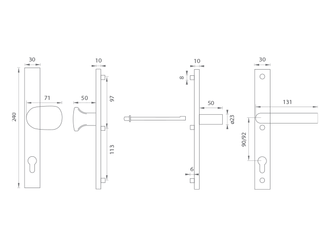 U zpevněného kování je třeba znát vzdálenost mezi osou kliky a osou klíče (rozteč). Standardní rozteč kování je 92 mm. Alternativní rozteč 90 mm získáme otočením čtyřhranu 6 x 8 mm o 90 °. Čtyřhran 6 x 8 mm je součástí balení kování v rozteči 90 mm.
