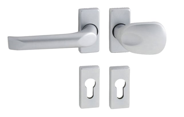Rozetová klika na vchodové a bezpečnostní dveře se zpevněnou hranatou úzkou rozetou bez překrytí cylindrické vložky je vyrobena z hliníku a je povrchově upravena. Hranatá úzká rozeta má rozměry 31 mm x 68 mm a tloušťku 12 mm.