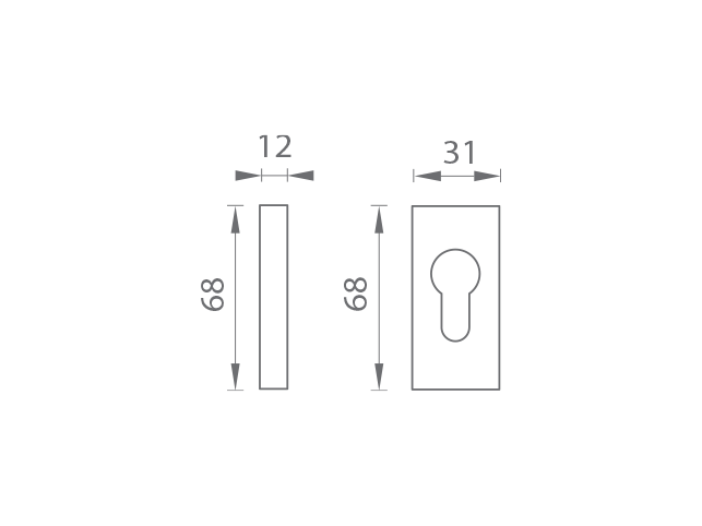 Úzká hranatá rozeta je vyrobena z hliníku a je povrchově upravena. Rozeta má rozměry 31 mm x 68 mm, tloušťku 12 mm a otvor pro cylindrickou vložku (PZ). Balení obsahuje 2 kusy rozet (pár)