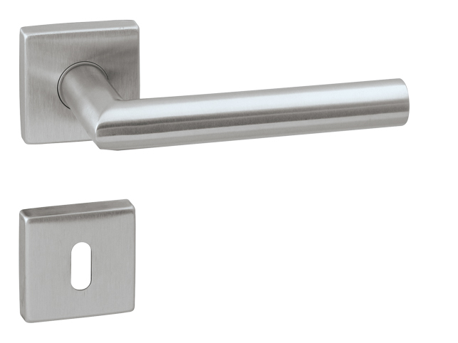 Rozetová klika na interiérové ​​dveře s hranatou rozetou je vyrobena z vysoce kvalitní nerezavějící oceli, známé jako nerez a je povrchově upravena.