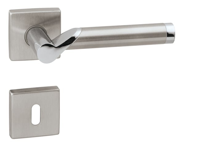Rozetová klika na interiérové ​​dveře s hranatou rozetou je vyrobena z vysoce kvalitní nerezavějící oceli, známé jako nerez a je povrchově upravena.